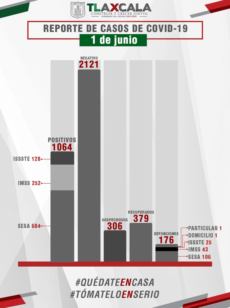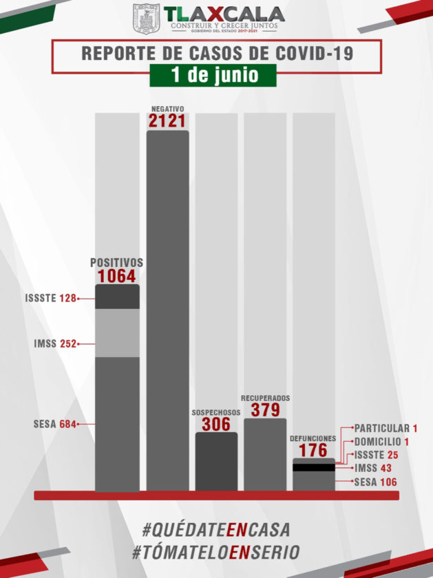 De esta manera, la entidad registra 379 personas recuperadas de la enfermedad, mil 64 casos positivos y 176 fallecimientos.