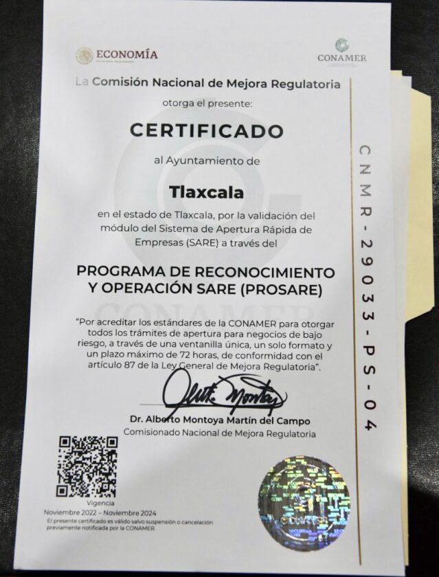 En la víspera, la tesorera municipal, Yolanda Cervantes Zamora, en representación del alcalde, Jorge Corichi, recibió de manos de la gobernadora, Lorena Cuellar Cisneros, y de Alberto Montoya Martín del Campo, titular de la CONAMER, el certificado para seguir implementando procesos para la realización de operaciones de manera fácil, rápida y transparente en el municipio de Tlaxcala.