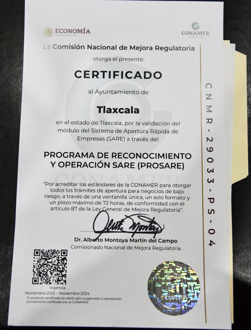El Ayuntamiento de la Ciudad de Tlaxcala obtuvo la certificación del Programa de Reconocimiento y Operación SARE (PROSARE) que otorga la Comisión Nacional de Mejora Regulatoria (CONAMER) a las ciudades que apoyan la apertura de negocios de bajo riesgo en solo 72 horas.