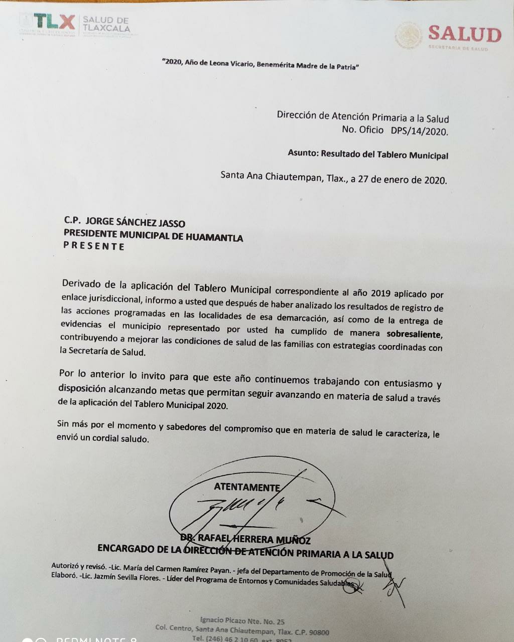 Huamantla, Tlax.-El Presidente Municipal de Huamantla Jorge Sánchez Jasso, recibió la constancia que acredita al municipio como “SOBRESALIENTE” al obtener buenos resultados en la aplicación de las acciones programadas en las localidades de Huamantla y que forman parte del Tablero Municipal 2019, que contribuyen a mejorar las condiciones de salud de las familias mediante estrategias que se coordinan con la Secretaria de Salud del Estado y Federal.