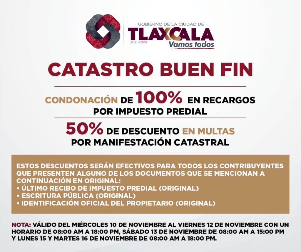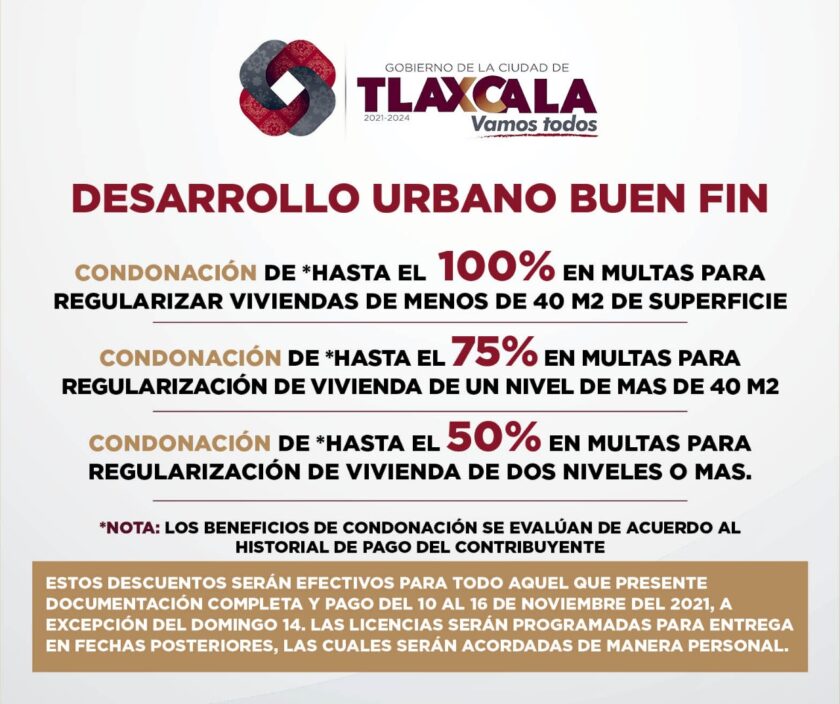 El área de Desarrollo Urbano del Ayuntamiento de Tlaxcala también se suma a los descuentos del Buen Fin 2021, ofreciendo la condonación del 100%, 75% y 50% en multas para regularización de viviendas de uno, dos o más niveles, previo análisis de su situación actual.