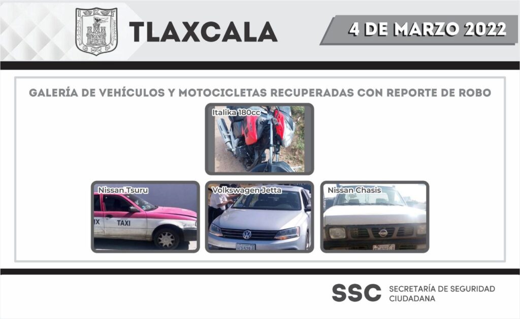 A través del uso de tecnologías de rastreo, operativos de seguridad y vigilancia; así como brindando la atención inmediata al Servicio de Emergencias 911, se aseguraron cuatro vehículos con reporte de robo vigente en los municipios de Xaltocan, Tlaxco, Zacualpan y Tequexquitla, respectivamente.