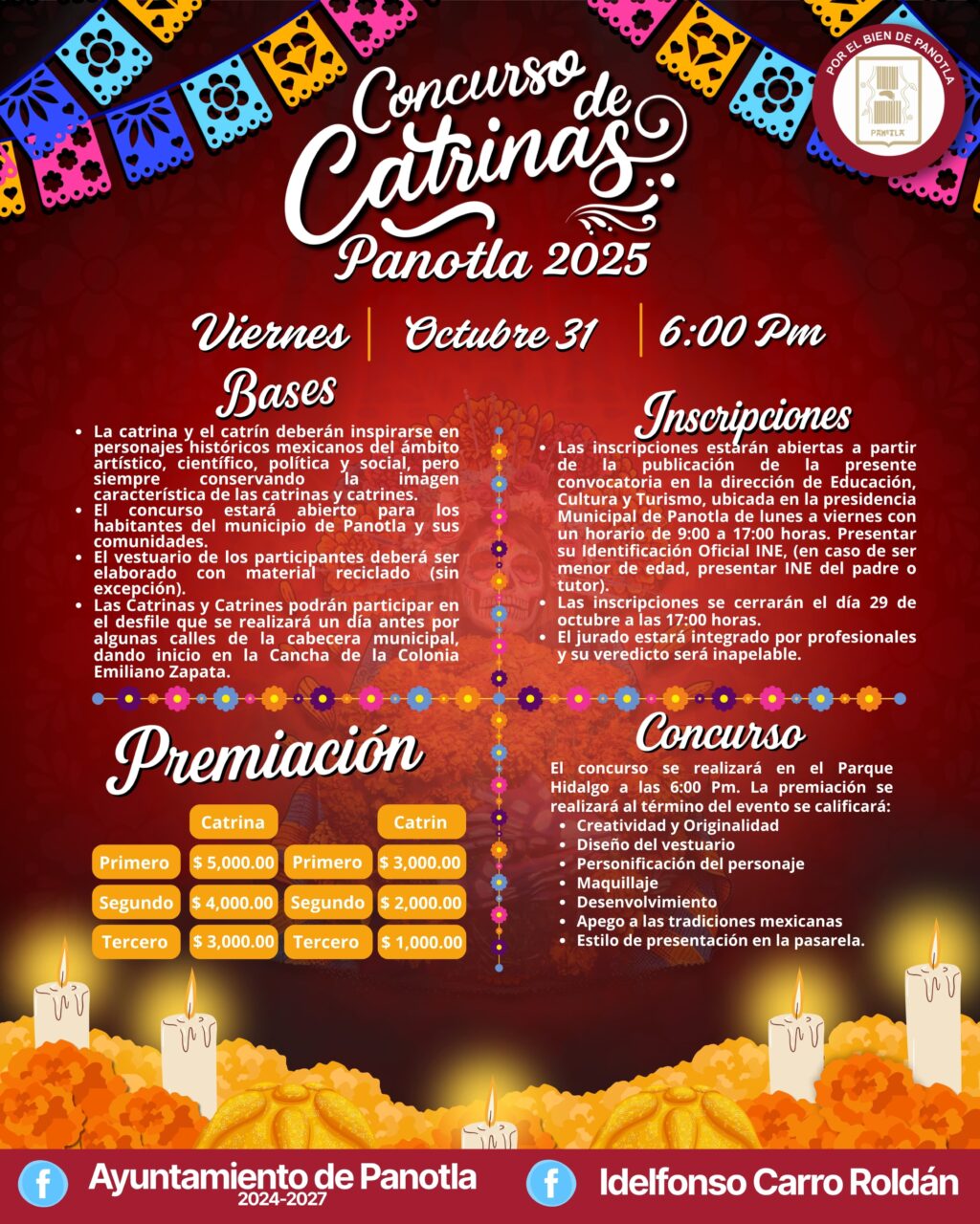 El H. Ayuntamiento de Panotla, que encabeza el presidente municipal Idelfonso Carro Roldán, a través de la Dirección de Educación, Cultura y Turismo, invita a la ciudadanía a participar en el Concurso de Catrinas Panotla 2025, una actividad que busca preservar y promover nuestras tradiciones mexicanas.