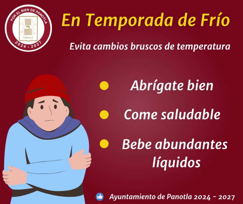 El H. Ayuntamiento de Panotla, el cual es encabezado por el Presidente Municipal Idelfonso Carro Roldán, a través de la Dirección de Salud hace un llamado a la población de la cabecera municipal y comunidades para extremar precauciones ante el descenso de temperaturas registrado en los últimos días. Es fundamental proteger la salud de las familias, especialmente de los grupos más vulnerables como niñas, niños, adultos mayores y personas con enfermedades crónicas.
