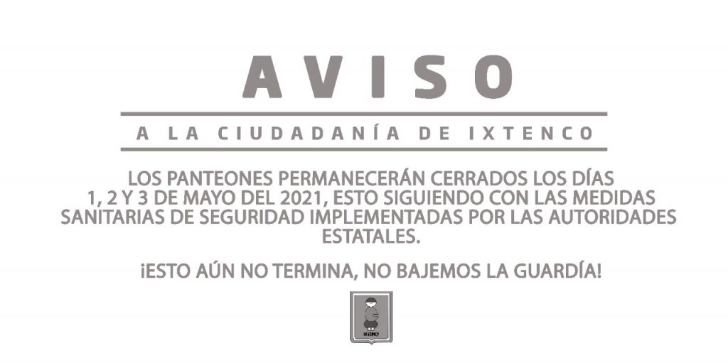 El Ayuntamiento de Ixtenco anunció a la ciudadanía que los camposantos de esa demarcación, permanecerán cerrados los días 1, 2 y 3 de mayo de la presenta anualidad.