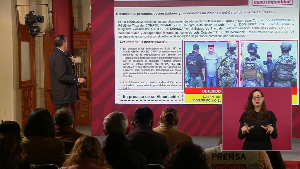“Informar de la detención de presuntos secuestradores y generadores de violencia en el estado de Tlaxcala… es un operativo realizado por la Procuraduría de Tlaxcala, la Coordinación antisecuestros, la Secretaría de Marina y el Centro Nacional de Inteligencia”, agregó.