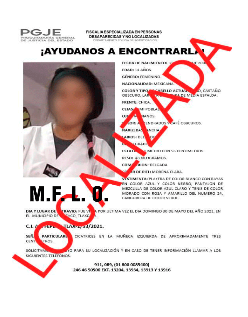 La Procuraduría General de Justicia del Estado (PGJE) a través de la Policía de Investigación adscrita a la Fiscalía Especializada en Personas Desaparecidas y No Localizadas, ubicó a una menor de edad reportada como extraviada en el municipio de Apizaco.
