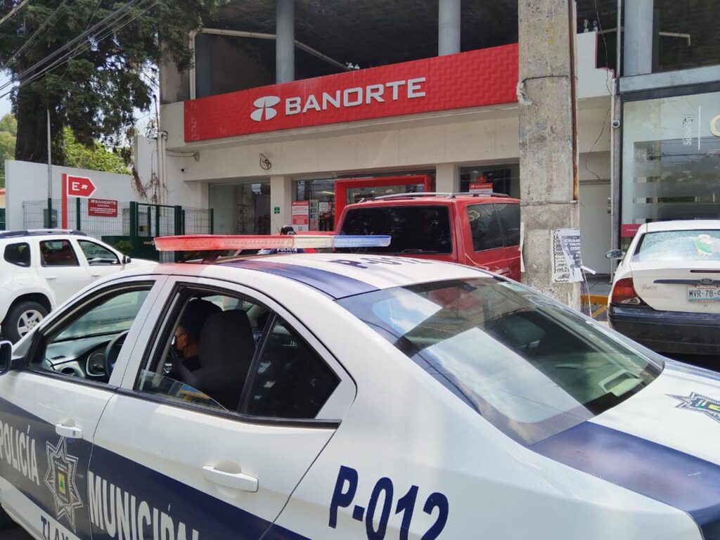 Integrantes de la Dirección de Seguridad Ciudadana y Movilidad del Municipio de Tlaxcala efectúan labores de proximidad social en sucursales bancarias, con la finalidad de prevenir delitos como asaltos y robo a cuentahabiente.