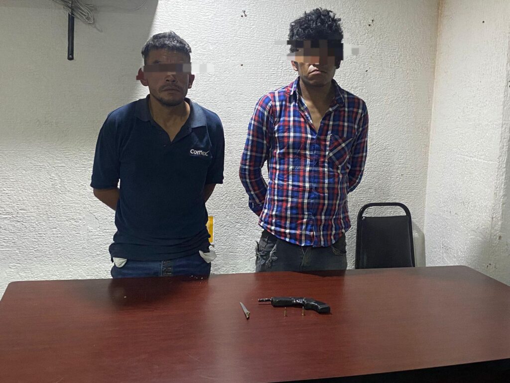 Durante la inspección preventiva, los oficiales detectaron que uno de los individuos portaba un arma de fuego corta tipo revólver, así como un cartucho útil, mientras que el segundo portaba un objeto punzocortante tipo arma blanca. Ante la negativa de ambos a someterse voluntariamente a la revisión y al mostrar una actitud evasiva y agresiva, se procedió conforme a protocolo a su aseguramiento.