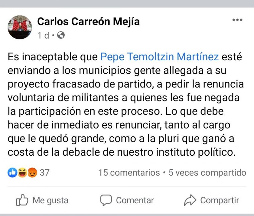 Así lo manifestó el Diputado Federal, Carlos Carreón Mejía, quien en sus redes sociales, expresó que Temoltzin Martínez solo se preocupó por construir su próxima posición plurinominal en el Congreso del Estado, y dejó que el partido se hundiera lentamente con falta de planeación y estrategia.