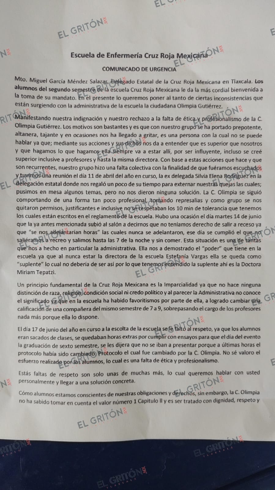 Por medio de un “comunicado de urgencia” los quejosos, relataron al actual delegado de Cruz Roja, Miguel García Méndez Salazar, que Olimpia Gutiérrez ha mostrado su descontento contra un determinado grupo, que en repetidas ocasiones han solicitado el cese de la administradora, sin tener éxito.