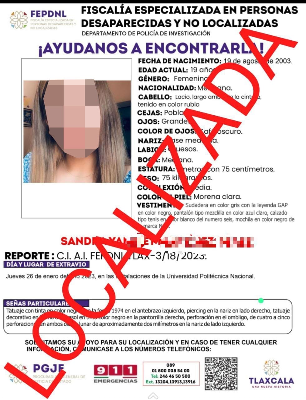 Agentes de la Policía de Investigación adscritos a la Fiscalía Especializada en Personas Desaparecidas y No Localizadas (Fepdnl), de la Procuraduría General de Justicia del Estado (PGJE) localizaron a una persona del sexo femenino, quien fue reportada como desaparecida por sus familiares.