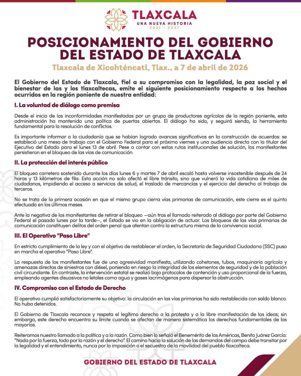 El Gobierno del Estado de Tlaxcala, fiel a su compromiso con la legalidad, la paz social y el bienestar de las y los tlaxcaltecas, emite el siguiente posicionamiento respecto a los hechos ocurridos en la región poniente de nuestra entidad: