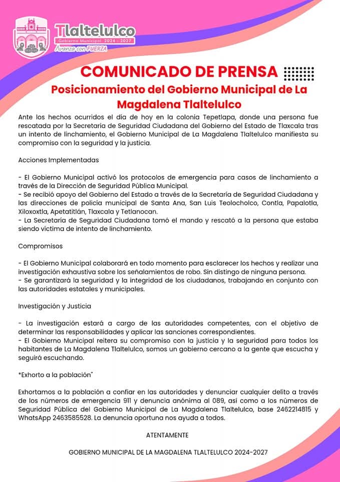 Ante los hechos ocurridos el día de hoy en la colonia Tepetlapa, donde una persona fue rescatada por la Secretaría de Seguridad Ciudadana del Gobierno del Estado de Tlaxcala tras un intento de linchamiento, el Gobierno Municipal de La Magdalena Tlaltelulco manifiesta su compromiso con la seguridad y la justicia.