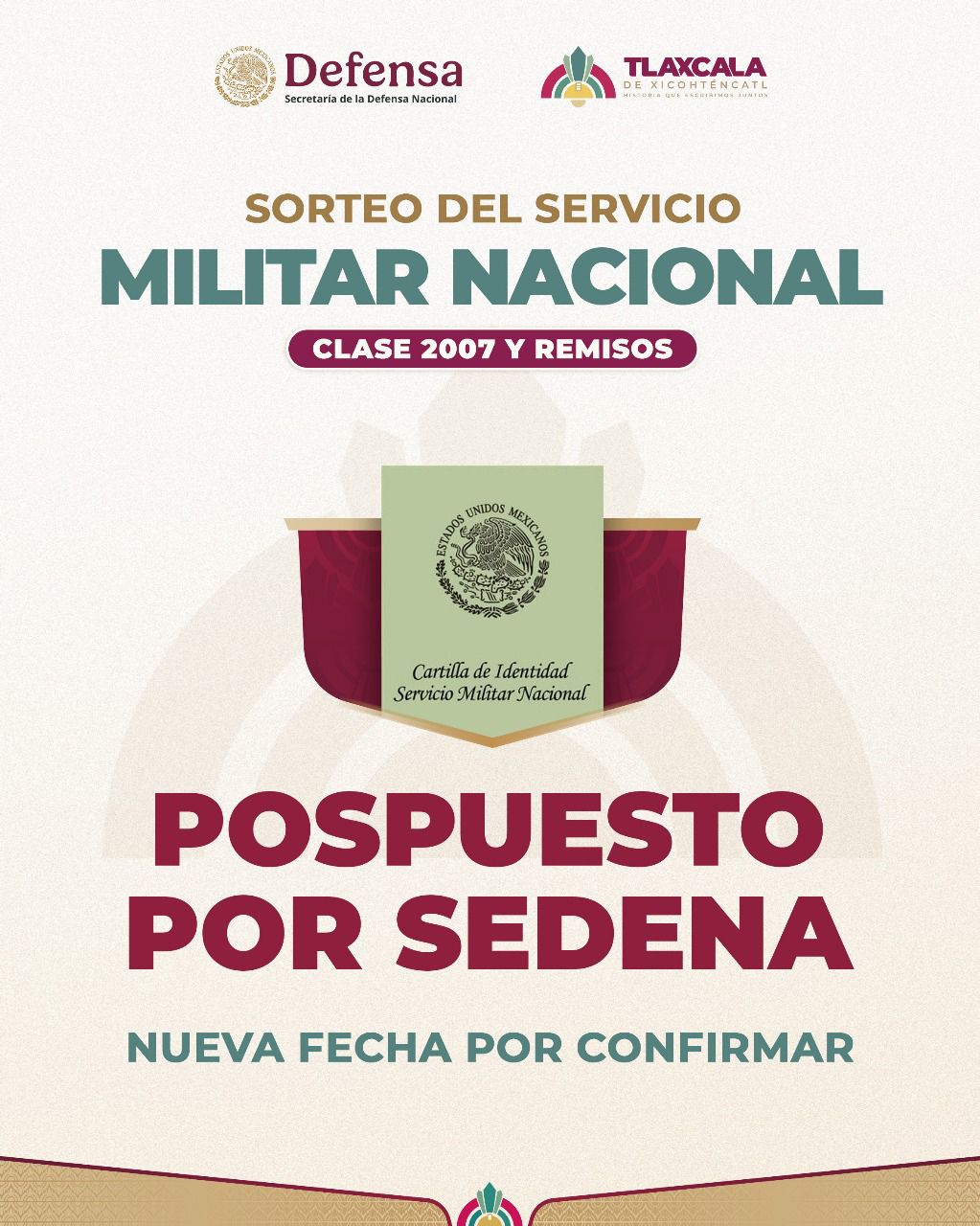 El Ayuntamiento de Tlaxcala informa a los jóvenes de la clase 2007 y remisos que, por instrucciones de la Secretaría de la Defensa Nacional (Sedena), el Sorteo del Servicio Militar Nacional, programado para el domingo 9 de noviembre de 2025 en la capital, se pospone hasta nuevo aviso.