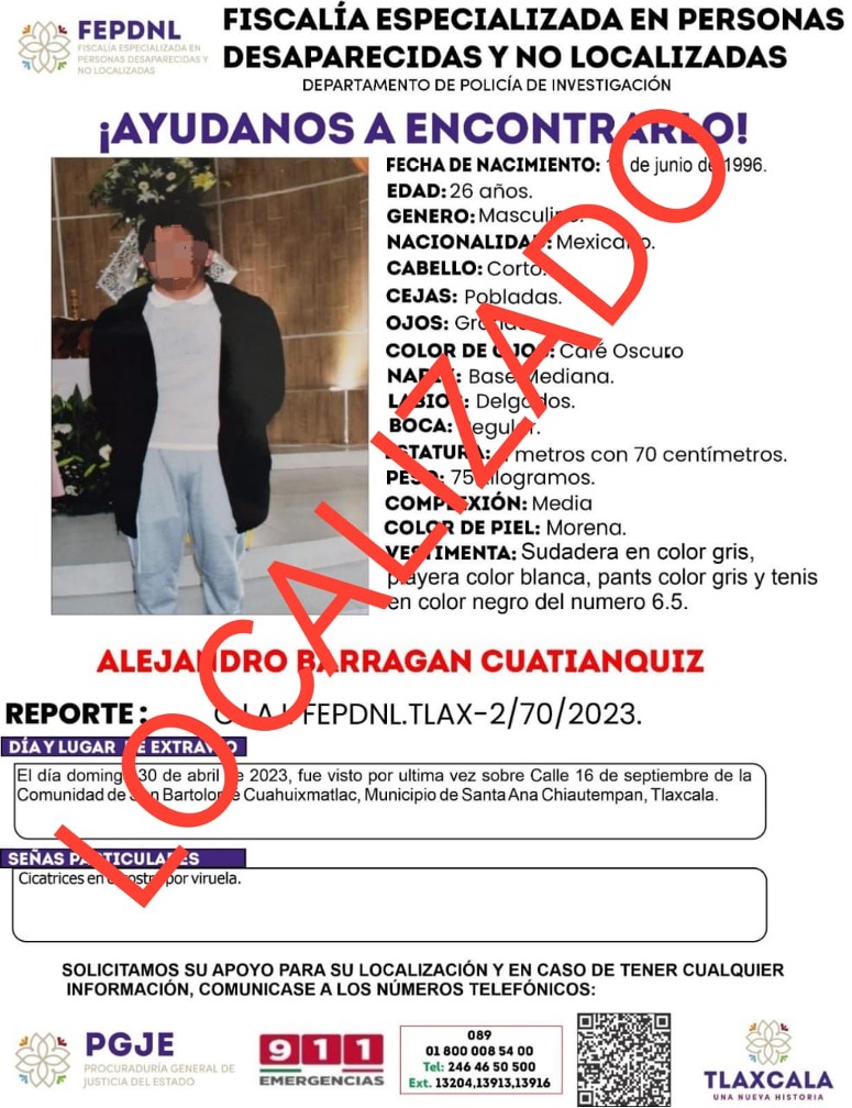 La Fiscalía Especializada en Personas Desaparecidas y No Localizadas (Fepdnl) adscrita a la Procuraduría General de Justicia del Estado (PGJE) presentó a una persona del sexo masculino, reportado como desaparecido por sus familiares.