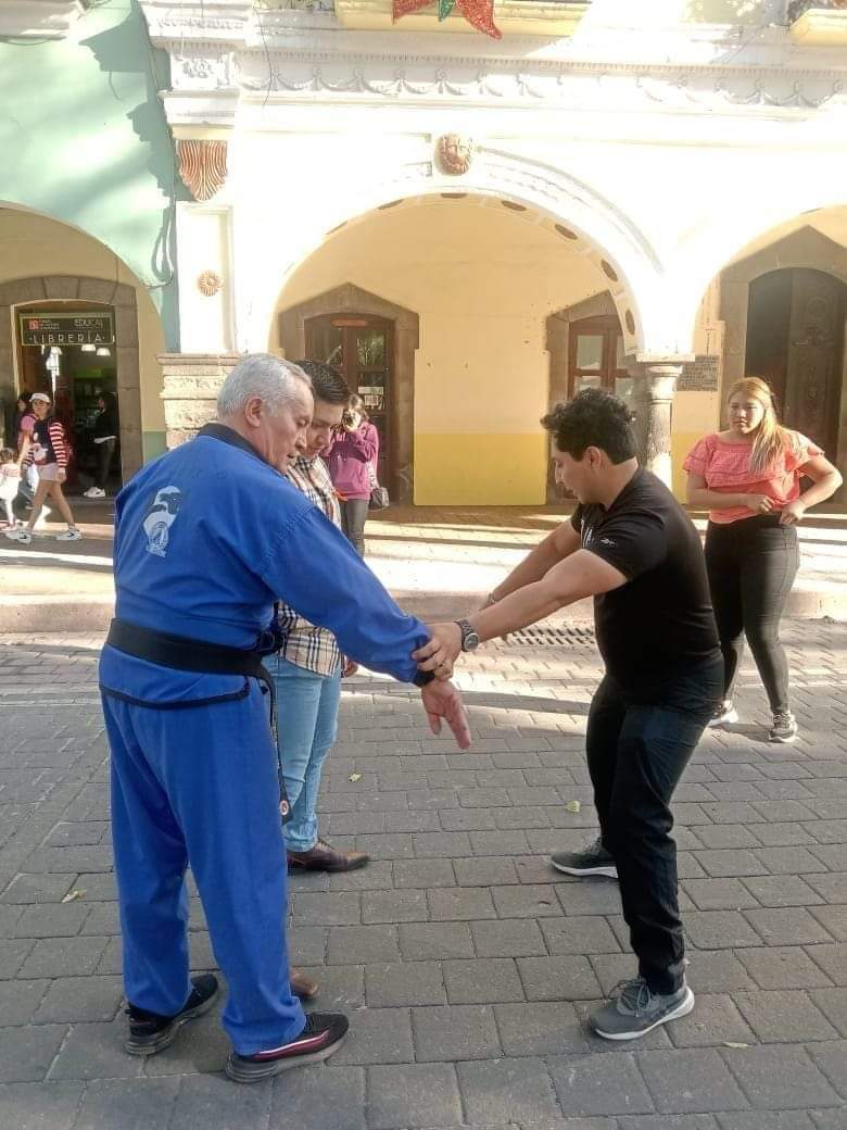 La intención de esta clase práctica en la que participaron niños jóvenes y adultos que se dieron cita en la Plaza de la Constitución es que aprenda las técnicas básicas de defensa ante cualquier situación que se pudiera presentar y que pueda poner en riesgo su integridad física.