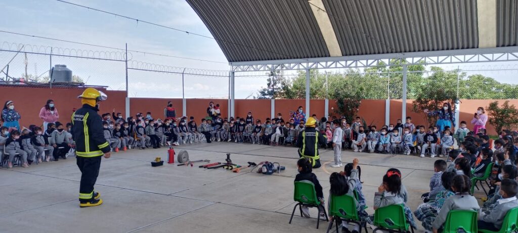 Personal de bomberos acudió al Centro de Educación Preescolar, ubicado en San Isidro Buen Suceso del municipio de San Pablo del Monte, donde ofrecieron una plática a alumnos, padres de familia y maestros sobre las actividades de emergencia, además de una demostración del equipo y herramientas que utilizan durante sus servicios y finalizaron con un simulacro a fuego real.