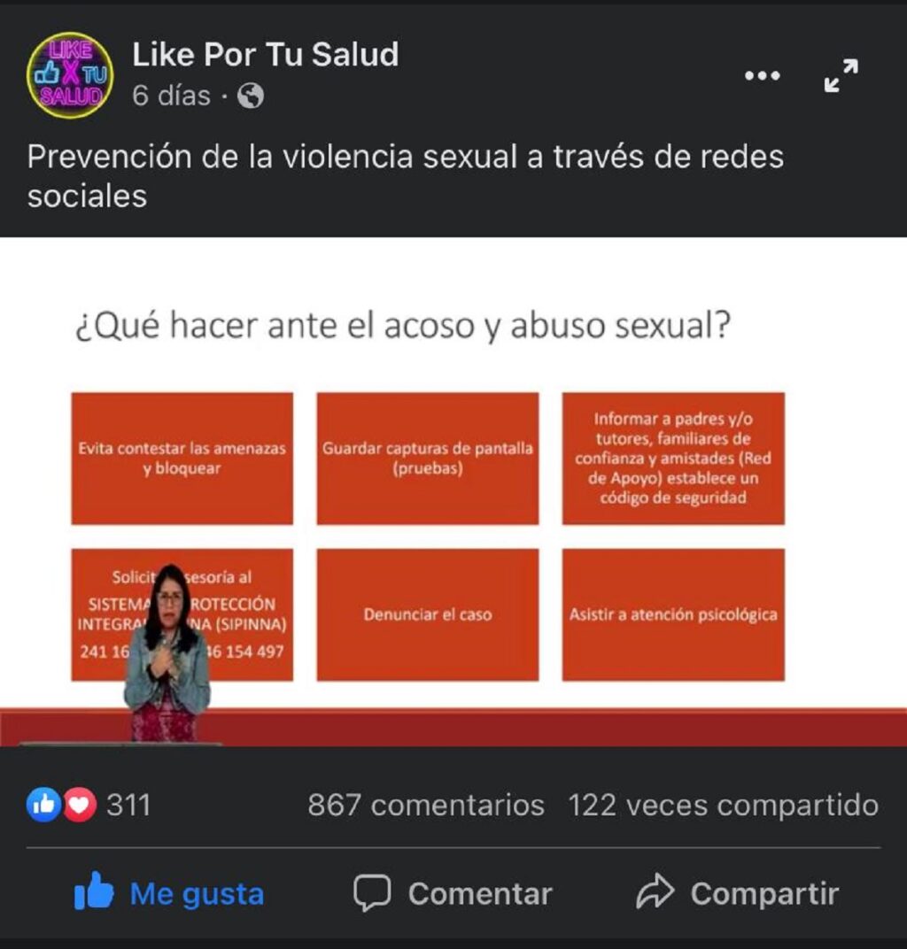 La Secretaría de Salud del Estado (SESA), impartió la conferencia virtual “Prevención de la violencia sexual en redes sociales”, esto como parte del programa de Salud Sexual y Reproductiva y los Servicios Amigables, a fin de prevenir casos de violencia en este sector de la población.