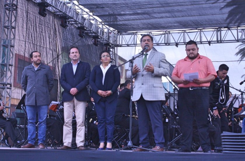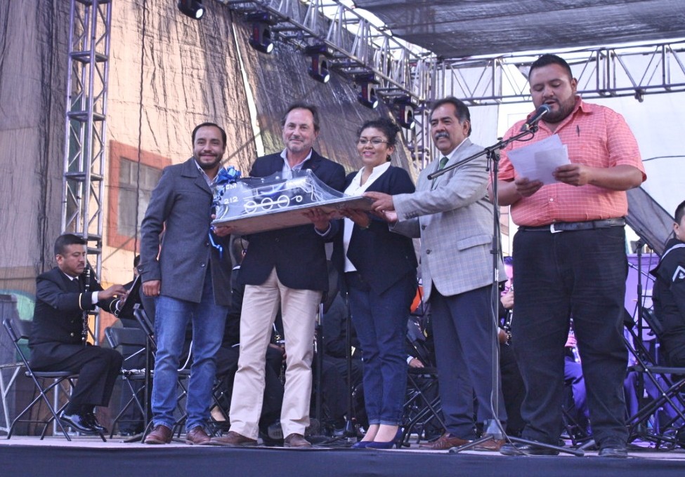 En la explanada del Parque Cuauhtémoc, en Apizaco, Luis Mariano Andalco López, Director del Instituto Tlaxcalteca de Desarrollo Taurino (ITDT) en representación de la Secretaria de Turismo, Anabel Alvarado Varela, entregó un reconocimiento con la figura de un toro y el hierro de la Ganadería “Piedras Negras” a la Banda Sinfónica de la Secretaría de Marina-Armada de México.