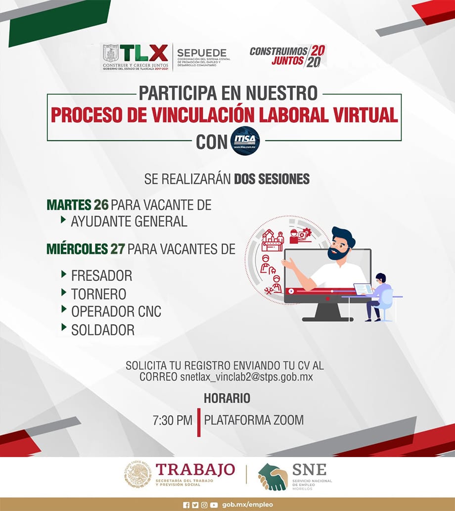El Sistema Estatal de Promoción del Empleo y Desarrollo Comunitario (Sepuede), a través del Servicio Nacional de Empleo (SNE) en Tlaxcala, invita al público en general a que participe en el Proceso de Vinculación Laboral Virtual, que se llevará a cabo los días 26 y 27 de mayo, a las 19:30 horas, en la plataforma Zoom.