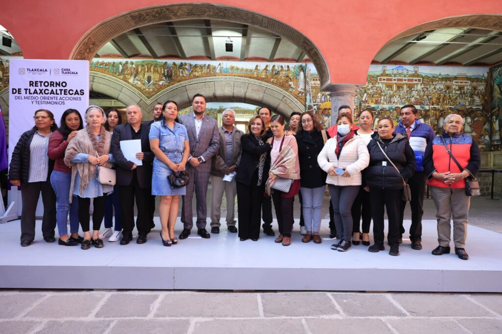 La titular del Ejecutivo local, Lorena Cuéllar Cisneros, acompañada del representante Delegacional, Promotor de Inversiones Extranjeras y Enlace Internacional de Casa Tlaxcala en Ciudad de México, Luis Vargas González, dio la bienvenida a los 22 connacionales tlaxcaltecas que retornaron a la entidad tras ser rescatados del conflicto armado entre Israel y Palestina.