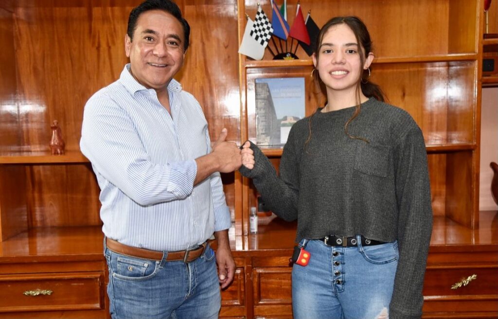 El alcalde de Tlaxcala, Jorge Corichi recibió este día a la destacada nadadora Bárbara Palafox, luego de que la joven promesa del deporte tlaxcalteca tuviera una participación brillante en los Juegos Deportivos Mundiales Escolares Sub 15 de natación, desarrollados en Belgrado, Serbia.