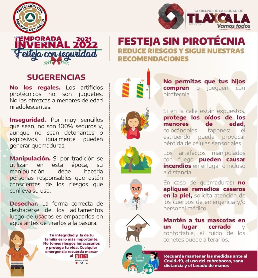 El Ayuntamiento de Tlaxcala recomienda evitar el uso de pirotecnia y en caso de utilizarla, seguir todas las recomendaciones de seguridad para su correcta manipulación y desecho.
