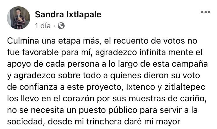“Culmina una etapa más, el recuento de votos no fue favorable para mí, agradezco infinita mente el apoyo de cada persona a lo largo de esta campaña y agradezco sobre todo a quienes dieron su voto de confianza a este proyecto, Ixtenco y zitlaltepec los llevo en el corazón por sus muestras de cariño, no se necesita un puesto público para servir a la sociedad, desde mi trinchera daré mi mayor esfuerzo día a día, a mi equipo les agradezco su entrega y dedicación, al Diputado electo le felicito y le pido trabaje sin distinción en pro del Distrito X y del Estado. Muchas gracias a todos!”, escribió.