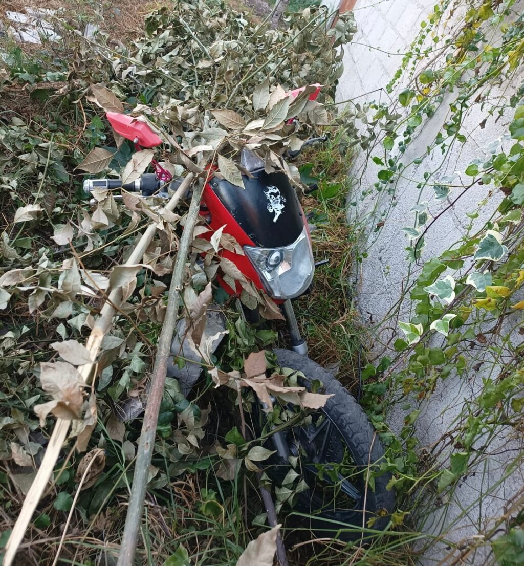 Los efectivos de seguridad municipal recibieron una llamada de los vecinos del lugar en la que reportaron el hallazgo de una motocicleta en un terreno baldío, cubierta por ramas y hojas.