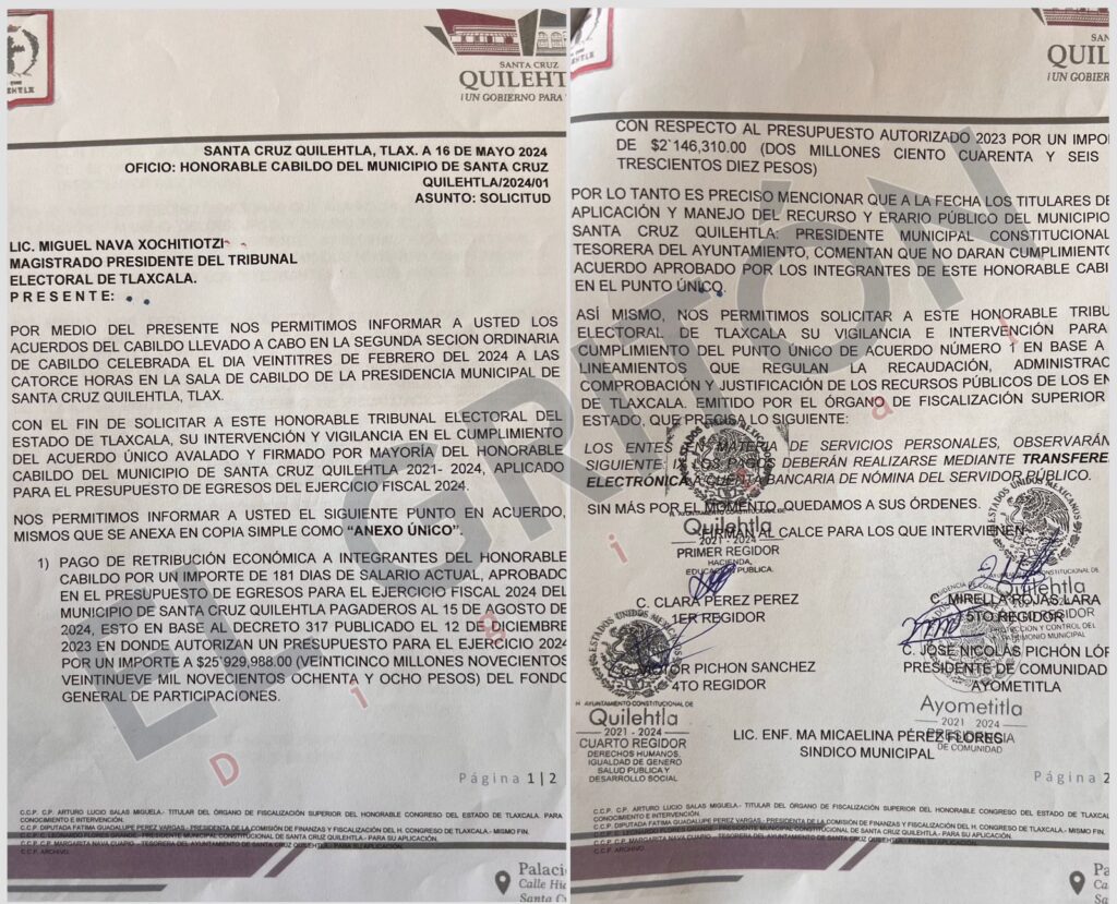 Tres regidores y el presidente de la comunidad de Ayometitla presentaron una impugnación ante el Tribunal Electoral de Tlaxcala (TET) para exigir una liquidación de dos millones de pesos por supuestos servicios prestados a la población, esto cuando aún no concluye el período administrativo 2024.