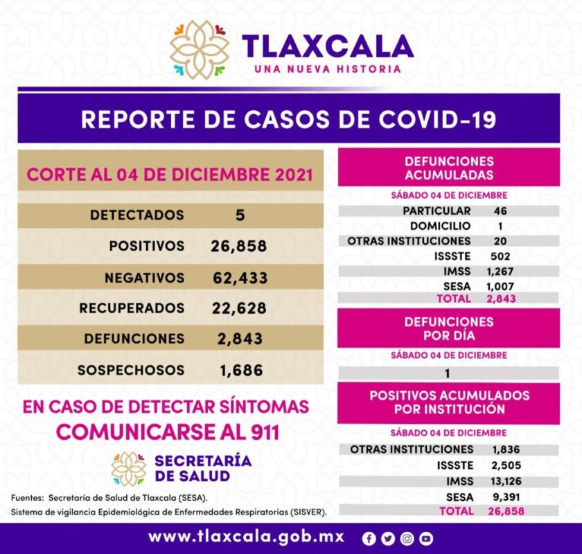 Los datos de la SESA registrados en la plataforma nacional del Sistema de Vigilancia Epidemiológica de Enfermedades Respiratorias (Sisver), confirmaron 5 casos positivos de Covid-19 y una defunción el 04 de diciembre de 2021.