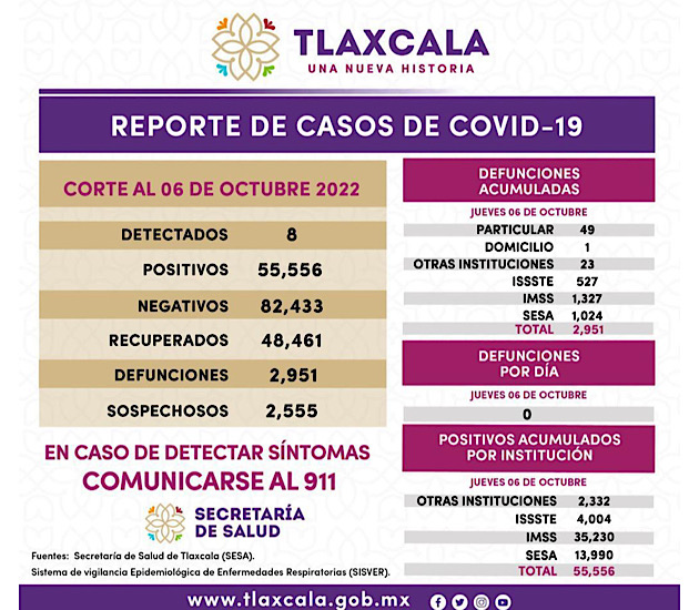 Los datos de la SESA registrados en la plataforma nacional del Sistema de Vigilancia Epidemiológica de Enfermedades Respiratorias (Sisver), confirmaron 8 casos positivos de Covid-19 y cero defunciones, el 6 de octubre de 2022 en la entidad.