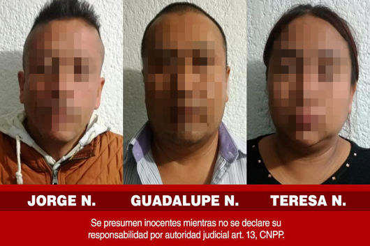 Derivado del trabajo de inteligencia, se estableció que Guadalupe N., de 48 años de edad, originario del estado de Puebla, presuntamente interceptó a las víctimas; Teresa N., de 31 años de edad, también originaria de Puebla, fungió presuntamente como cuidadora de las afectadas; y Jorge N., de 49 años, originario del Estado de México, presuntamente participó como negociador.