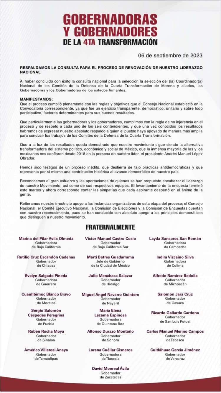 El posicionamiento fue respaldado por los 16 gobernadores de Morena, además de las seis gobernadoras emanadas del mismo partido, entre ellas, Lorena Cuéllar Cisneros.