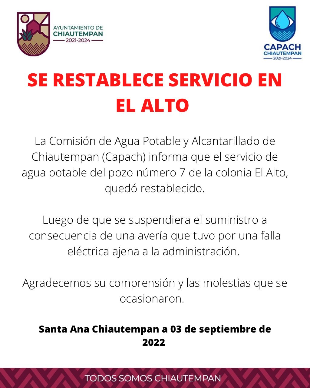 La Comisión de Agua Potable y Alcantarillado de Chiautempan (Capach) informa que el servicio de agua potable quedó restablecido en el pozo número 7, ubicado en la colonia El Alto.