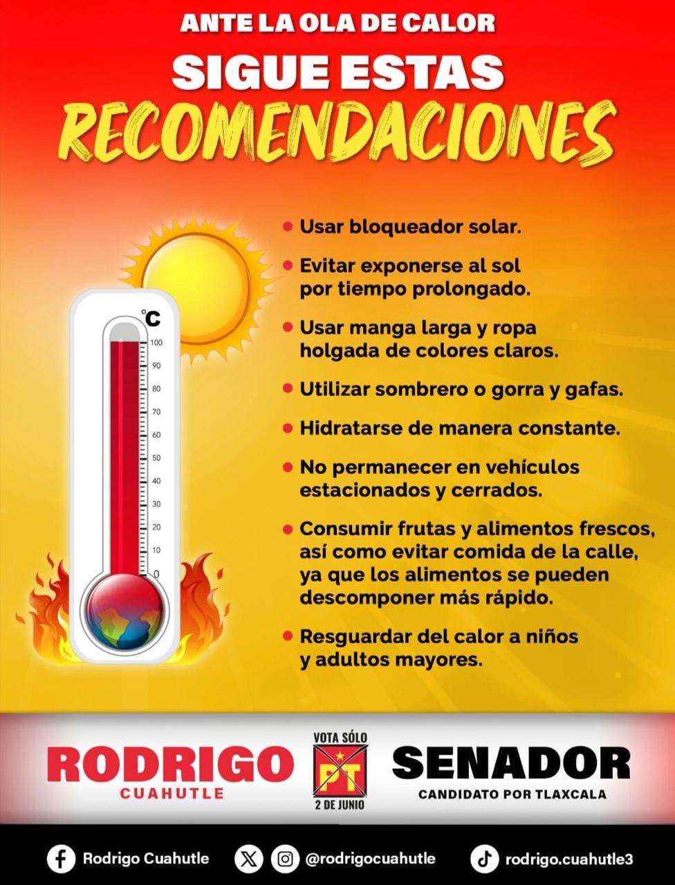 Ante la presente ola de calor que afecta a nuestro país y específicamente al estado de Tlaxcala, Rodrigo Cuahutle Salazar, candidato del Partido del Trabajo (PT) al Senado de la República, ha compartido una serie de valiosas recomendaciones destinadas a salvaguardar la salud y el bienestar de nuestra comunidad.