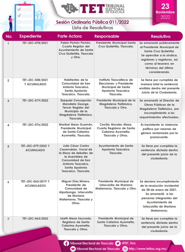 Por unanimidad de votos, la Magistrada Presidenta y Magistrados que integran el Pleno del Tribunal Electoral de Tlaxcala (TET), Claudia Salvador Angel, José Lumbreras García y Miguel Nava Xochitiotzi amonestaron a integrantes de los ayuntamientos de Santa Cruz Quilhetla, La Magdalena Tlaltelulco e Ixtacuixtla, por incumplimientos a sentencias dictadas por la autoridad jurisdiccional.