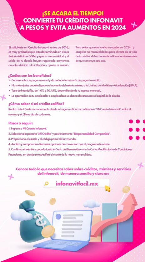 • Las personas con un crédito denominado en Veces Salario Mínimo (VSM) deben cambiar su crédito a pesos en Mi Cuenta Infonavit (micuenta.infonavit.org.mx) antes de que acabe 2023 para congelar sus pagos y su deuda.