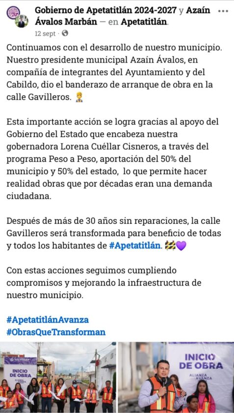 San Pablo Apetatitlán, Tlaxcala.— El pasado 12 de septiembre, el presidente municipal Azáin Ávalos Marbán presumió en sus redes sociales el arranque de obra en la calle Gavilleros, acompañado de integrantes del Ayuntamiento y del Cabildo. En la publicación, el edil aseguró que con esa acción “se seguían cumpliendo compromisos y mejorando la infraestructura del municipio”, gracias al programa Peso a Peso y al apoyo de la gobernadora Lorena Cuéllar Cisneros. “Después de más de 30 años sin reparaciones, la calle Gavilleros será transformada para beneficio de todas y todos los habitantes de Apetatitlán”, escribió en su cuenta oficial, junto al hashtag #ApetatitlánAvanza.