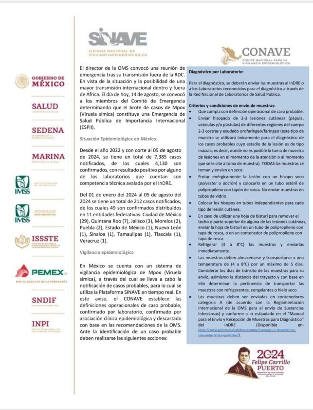 Según los informes del Sistema Nacional de Vigilancia Epidemiológica, se confirmaron 49 casos de viruela símica en México, distribuidos en 11 entidades federativas, incluida Tlaxcala. Desde enero de 2024 hasta el 5 de agosto, se notificaron un total de 212 casos, de los cuales 49 fueron confirmados en los siguientes estados: