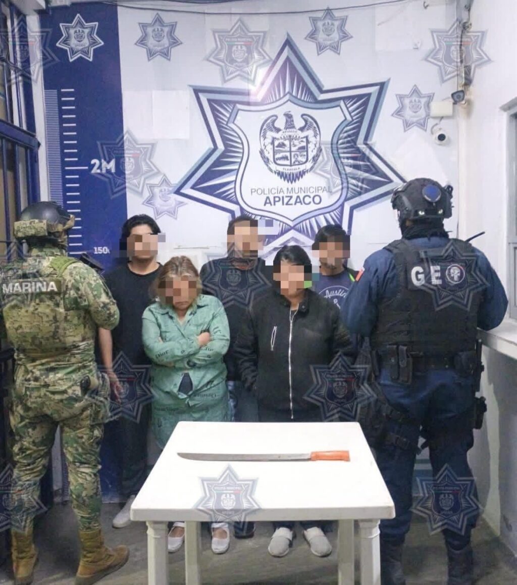 Por este motivo, cinco personas fueron detenidas: Yamiley “N” de 29 años, Roberta “N” de 51 años, Álvaro “N” de 30 años, Jesús David “N” de 19 años y Guadalupe “N” de 52 años, quienes fueron puestos a disposición de la Fiscalía General de Justicia del Estado (FGJE), para las investigaciones correspondientes.
