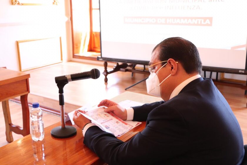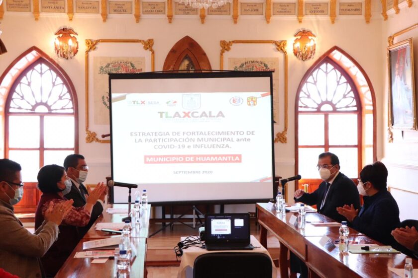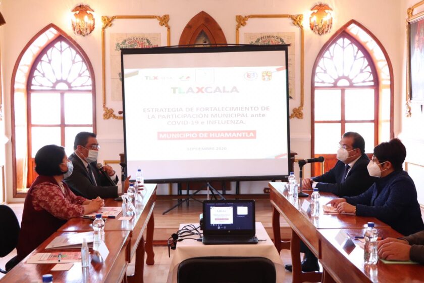 Huamantla, Tlax.- Este lunes en el salón de cabildos del Ayuntamiento de Huamantla y con el objetivo de que la población en situación de vulnerabilidad del municipio reciba información de cómo prevenir y tener los cuidados necesarios ante la pandemia ocasionada por COVID-19 y la influenza, se llevó a cabo la presentación de la “Estrategia de Fortalecimiento de la Participación Municipal ante COVID-19 e Influenza”.