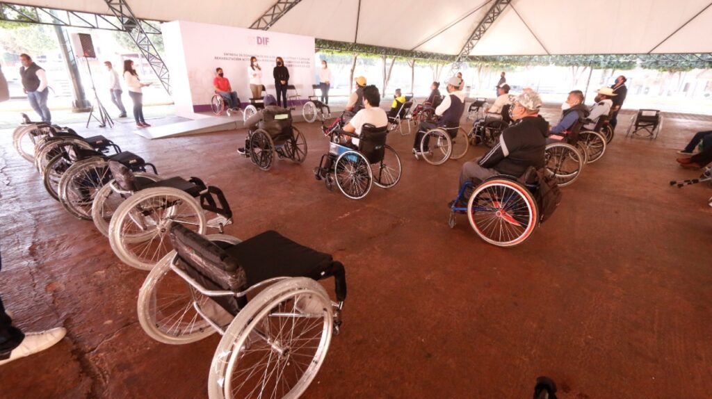 La presidenta honorífica del Sistema Estatal del Desarrollo Integral de la Familia (Sedif), Mariana Espinosa de los Monteros Cuéllar, entregó 18 sillas activas a personas con discapacidad.