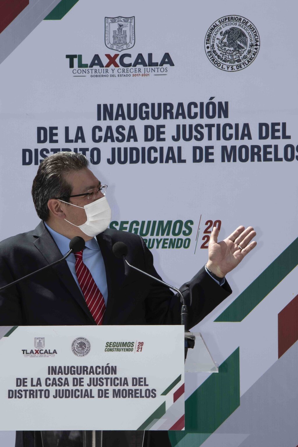 Al encabezar la inauguración de la Casa de Justicia del Distrito Judicial de Morelos, en Tlaxco, el Gobernador Mena, acompañado por Fernando Bernal Salazar, Magistrado Presidente del Tribunal Superior de Justicia del Estado, aseguró que Tlaxcala, a pesar de la pandemia de Covid-19, destaca por ser un estado que impulsa obra sin deuda, con inversión, empleo en crecimiento y que trabaja de la mano con los Poderes Públicos.