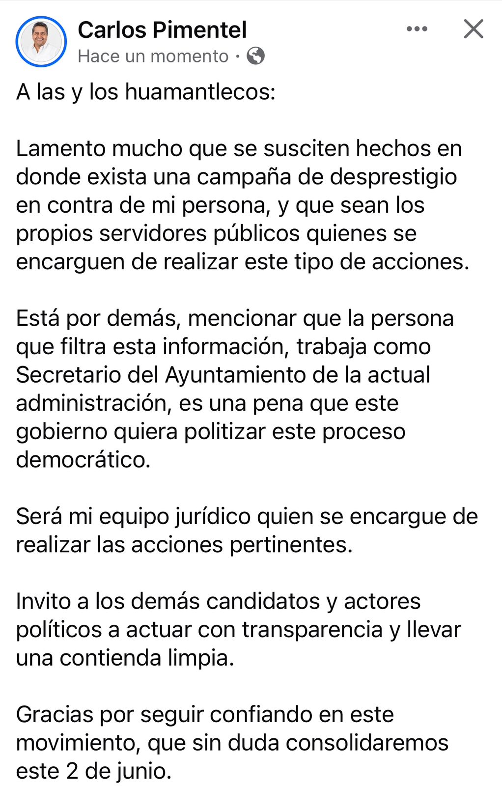 En el comunicado se podía leer solamente que lamentaba que existiera una campaña de desprestigio en su contra, pues quien lo denunció por alterar dicha carta es el actual Secretario del Ayuntamiento de Huamantla, Humberto Adrián Flores Martínez.