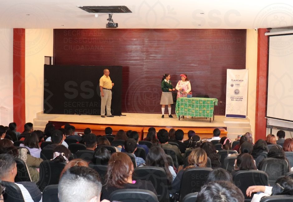 A través de la obra de teatro “Camino sin retorno” es como la Secretaría de Seguridad Ciudadana (SSC) sigue sensibilizando a las y los jóvenes tlaxcaltecas para prevenir cualquier hecho delictivo; así como para la erradicación de adicciones, la violencia de género, la violencia familiar y la trata de personas.