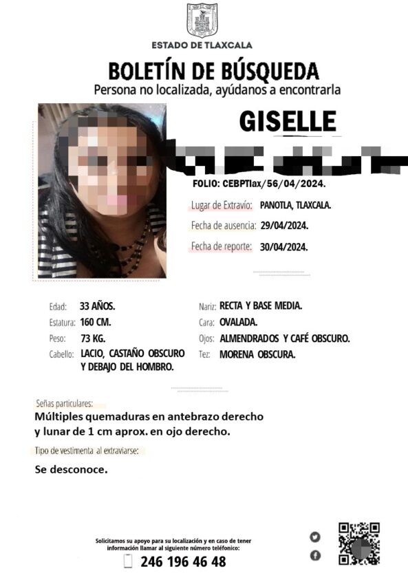 Con un boletín emitido por la Comisión Estatal de Búsqueda de Personas (CEBP), se confirmó su desaparición desde el 30 de abril, aunque familiares indicaron que perdieron contacto con ella desde el 29 de abril. La mujer fue encontrada sin vida debajo de un árbol en San Jorge Tezoquipan por un transeúnte.