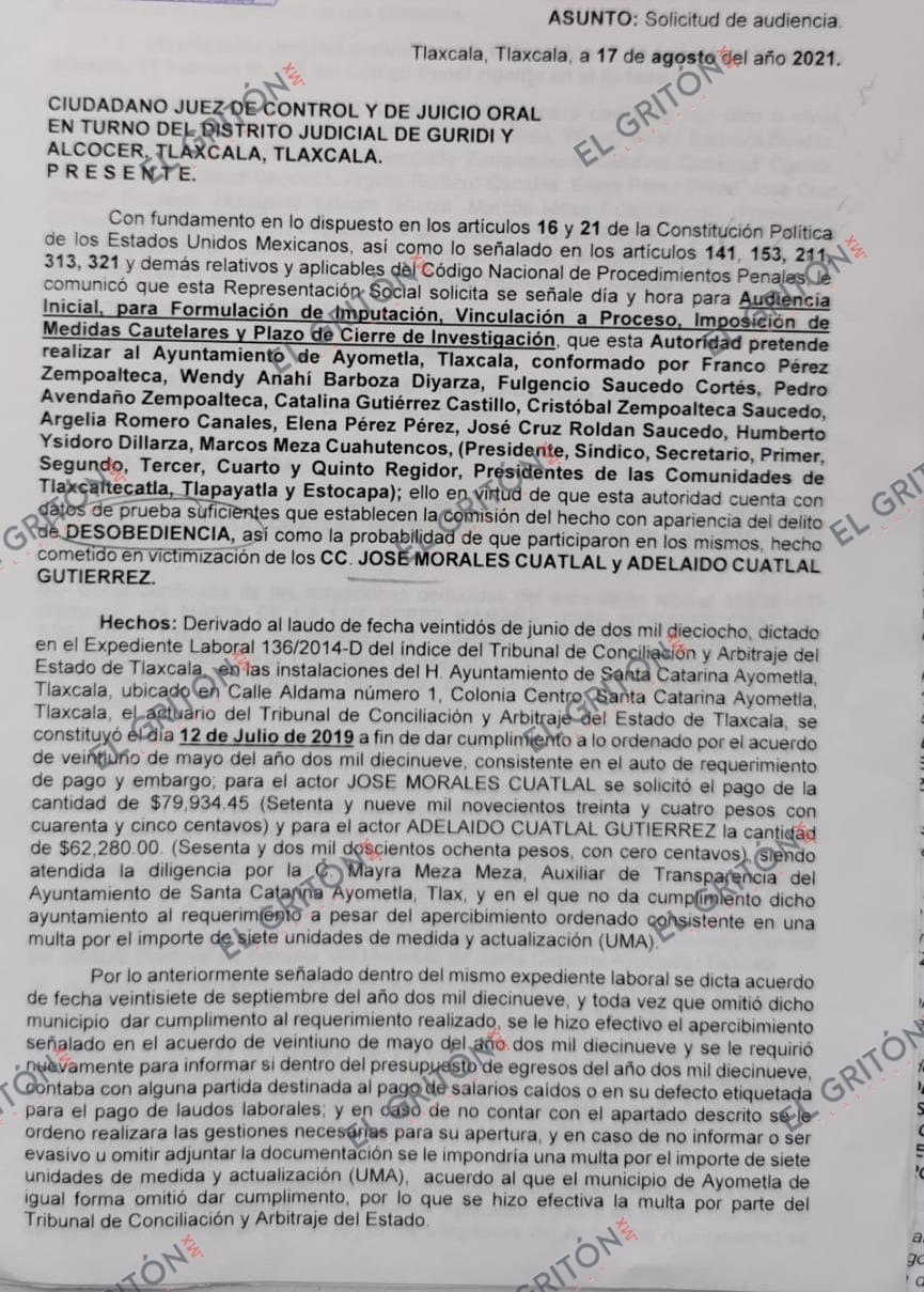 Por lo anterior, las víctimas solicitaron a la Fiscalía Anticorrupción de Tlaxcala que se ordenara audiencia, vinculación a proceso y expedición de medidas cautelares para los ex funcionarios de Ayometla.