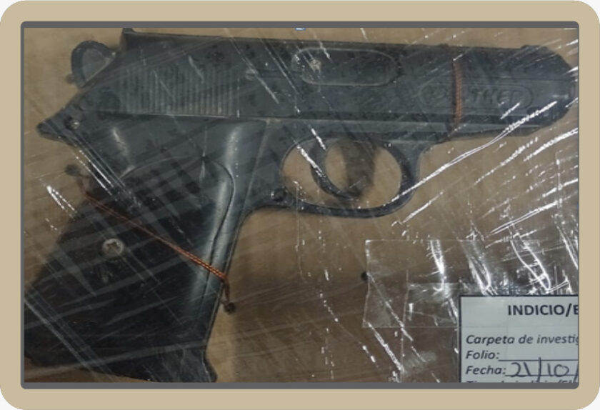 • El detenido portaba un arma de fuego tipo réplica, además de la portación de dos envoltorios con droga.